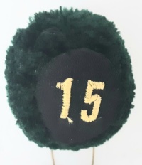 nappina in lana verde con numero 15 ricamato su fondo nero, cucito a mano