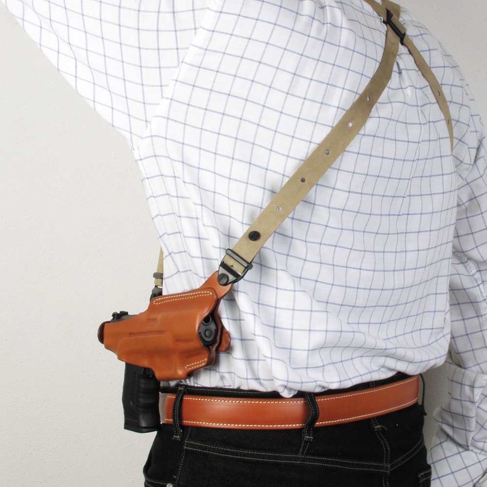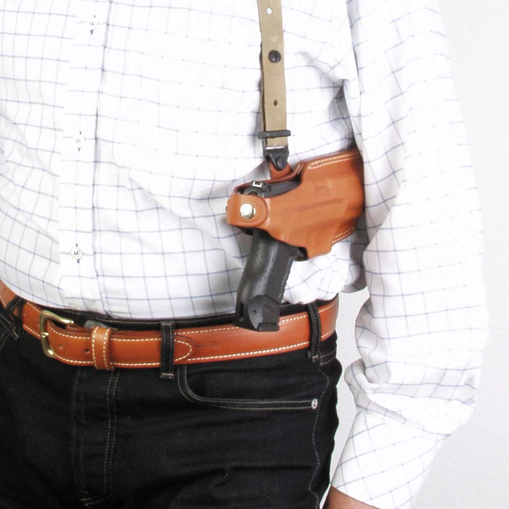 Ideata per un impiego ascellare, sia orizzontale che capovolto, può assumere varie inclinazioni variando la locazione degli ancoraggi e la regolazione della lunghezza dello spallaccio. Il corpo fondina può essere applicato anche in cintura con apposito passante mutiposizione.