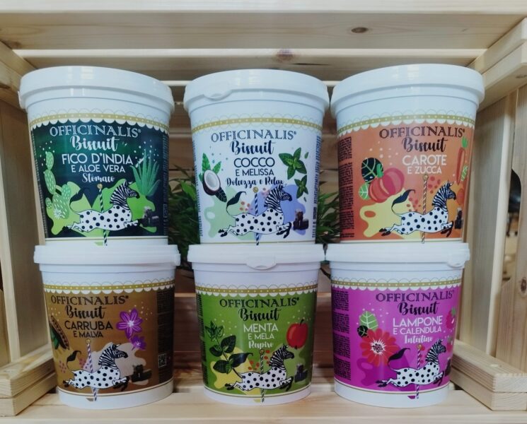 Biscotti naturali Officinalis in comoda scatola da 650gr Fico D’India/Aloe Vera| (Stomaco) Lampone/Calendula (Intestino) Cocco/Melissa (Dolcezza e Relax) Bardana/Pera|(Depura) Anice/Carbone (Digestione) Menta/Mela (Respiro)
