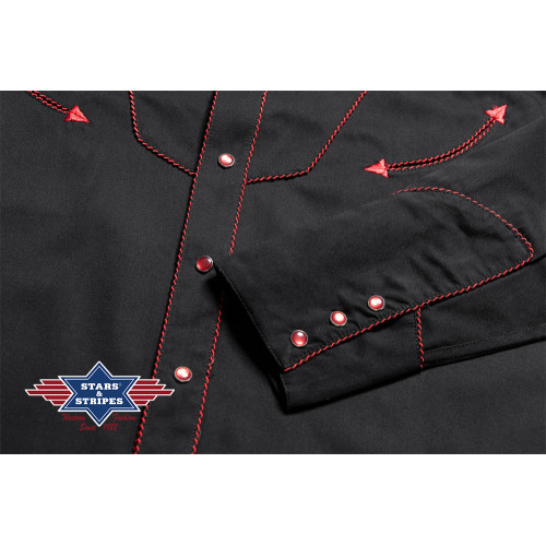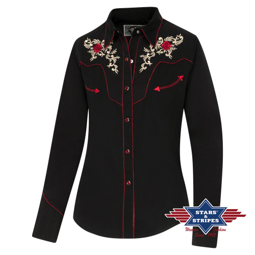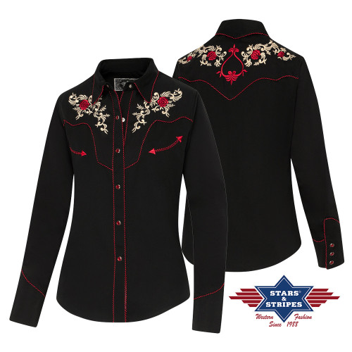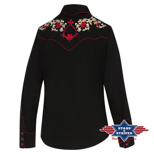 Camicia western nera con splendidi ricami floreali sul davanti e sulla schiena.