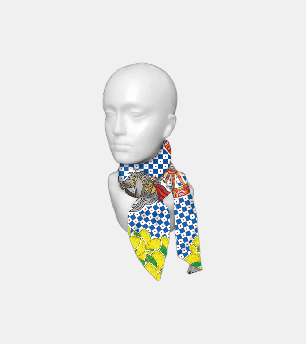 Fazzolettone Cavaliere 100 % Georgette Stampa in sublimazione. Misura: 90×90 cm Lavaggio a freddo (40°) e al rovescio.