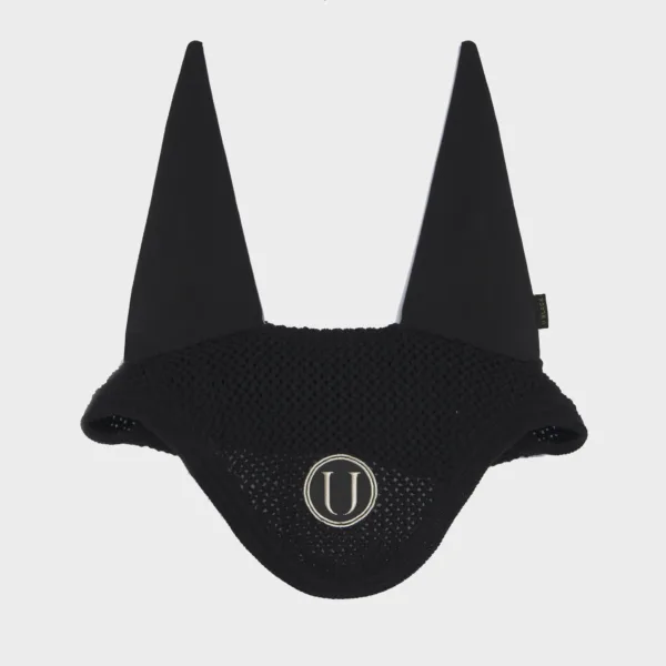 Cuffia da cavallo nera realizzata in Italia, 100% in cotone. Orecchie in morbido jersey. Patch ricamata con filo champagne.