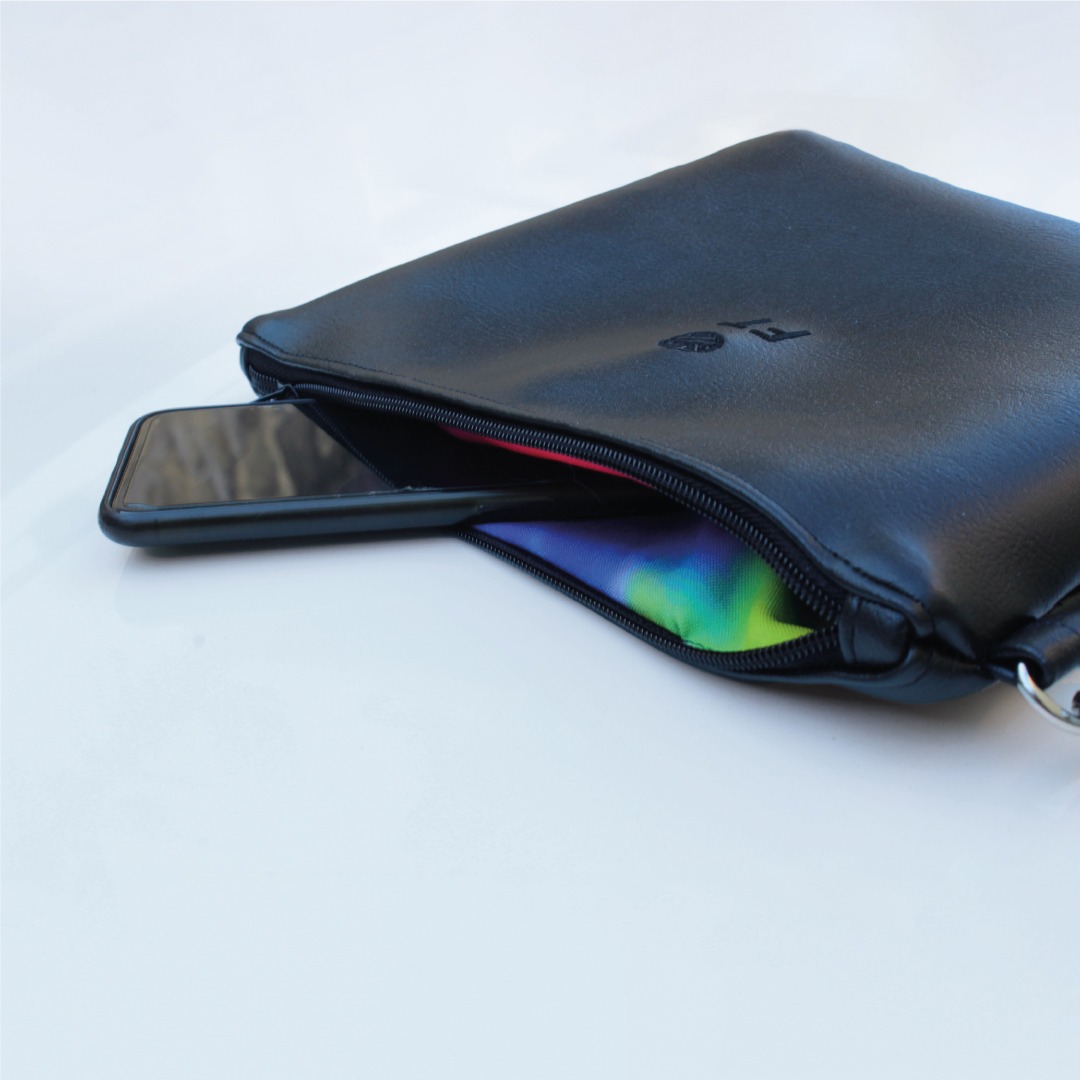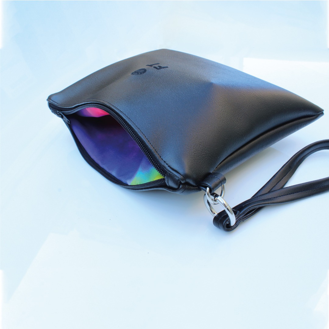 La combinazione tra l’ecopelle esterna e la fodera interna in fantasia arcobaleno crea un contrasto affascinante che rende ogni pochette unica e distintiva.