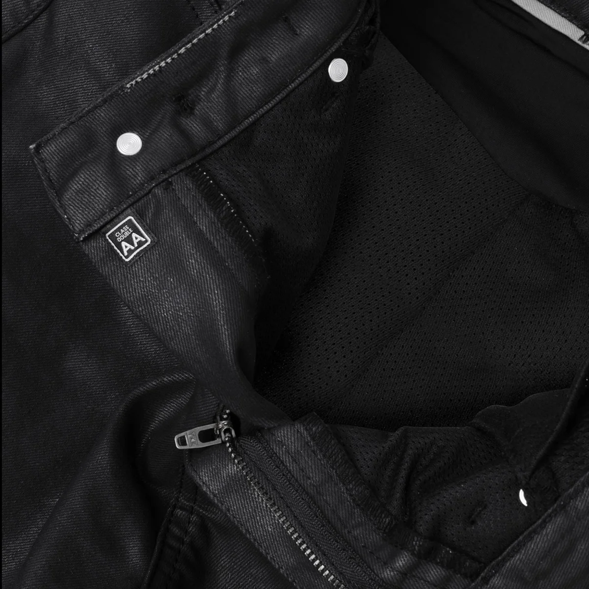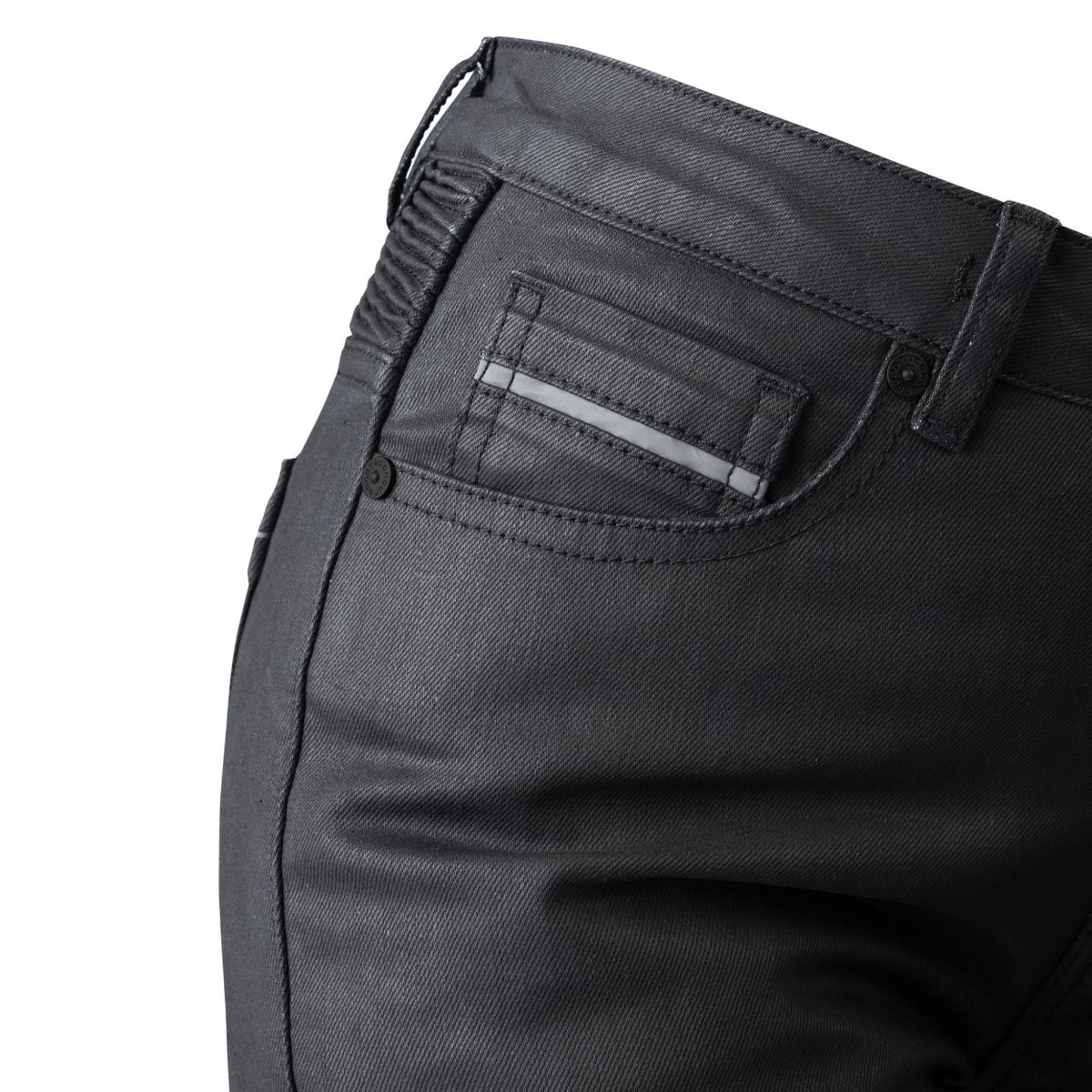 Jeans donna urbani, certificati moto CE – Classe AA, realizzati in denim stretch effetto cerato ad alta tenacità, resistente alla trazione e all’abrasione, con rinforzi in fibra aramidica antiabrasione e antistrappo sul retro.