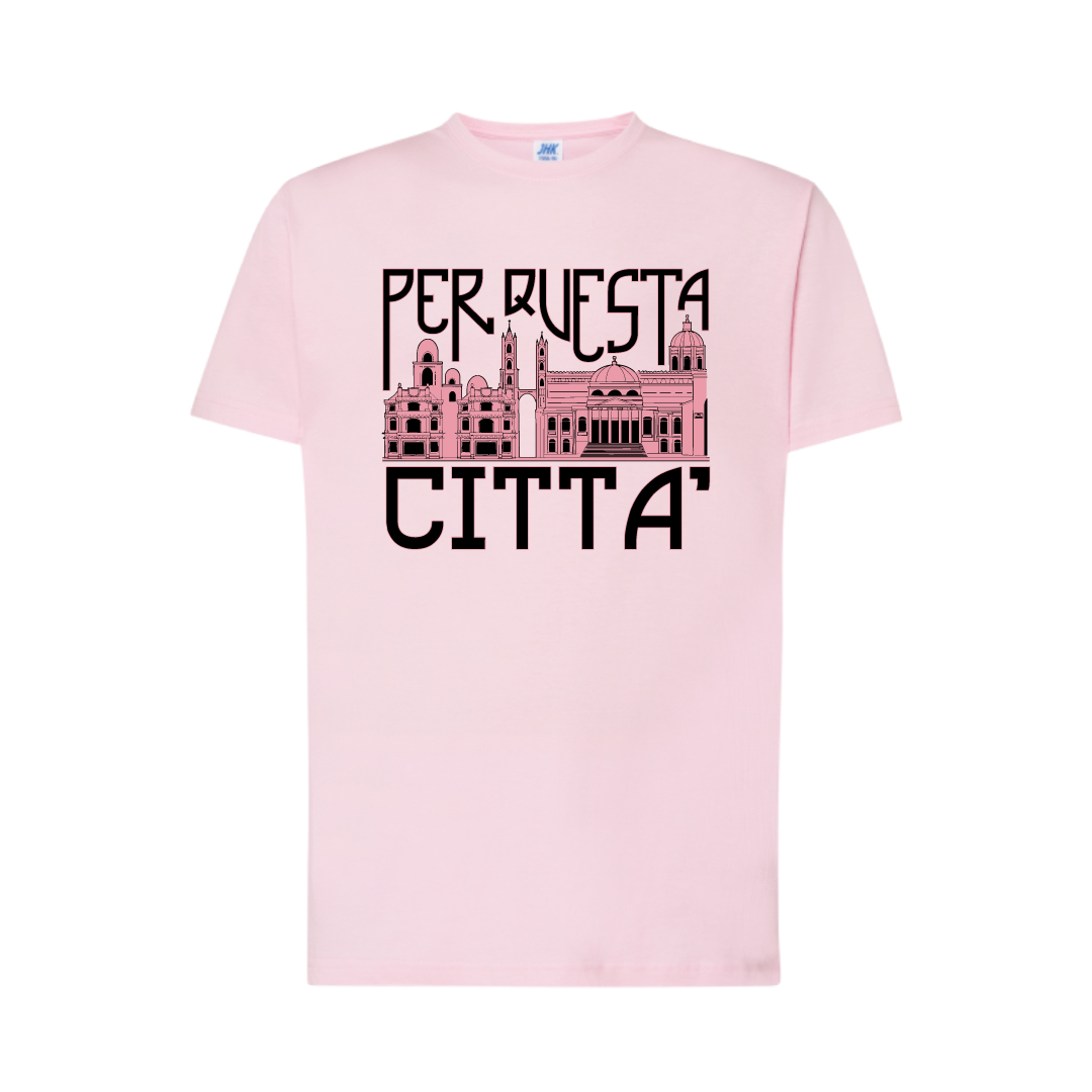La stampa della maglietta raffigura uno sfondo iconico della città di Palermo, un’immagine che evoca i monumenti e i luoghi più amati della città, catturati con dettagli precisi e riconoscibili. Il design è realizzato in due colori che contrastano perfettamente con il colore della maglietta, creando un effetto visivo che rende la stampa estremamente accattivante. Questa combinazione di colori assicura che il messaggio “Per Questa Città” sia chiaramente visibile e diventi un punto focale dell’intero design.