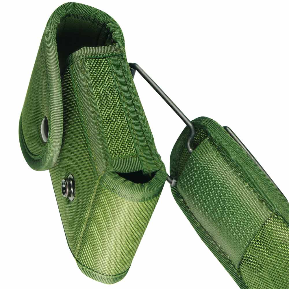 Porta due caricatori bifilare Nylon Tritech non termoformato, dispositivo interno anticaduta in polimero, doppia applicazione in cintura, verticale e orizzontale, chiusura con pattina e bottone a pressione con doppia posizione.