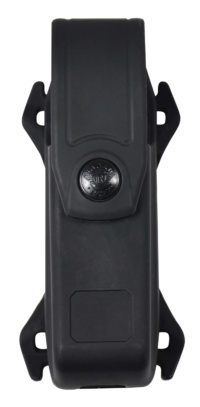 Porta caricatore bifilare pistola full size in Rubber-Tech iniezione monoblocco chiuso con pattina e doppio bottone a pressione con passante a osso orizzontale e verticale per cint. h30 e h50 mm.