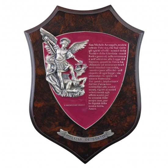 Crest montato su base lignea e placca metallica smaltata col testo della Preghiera a San Michele