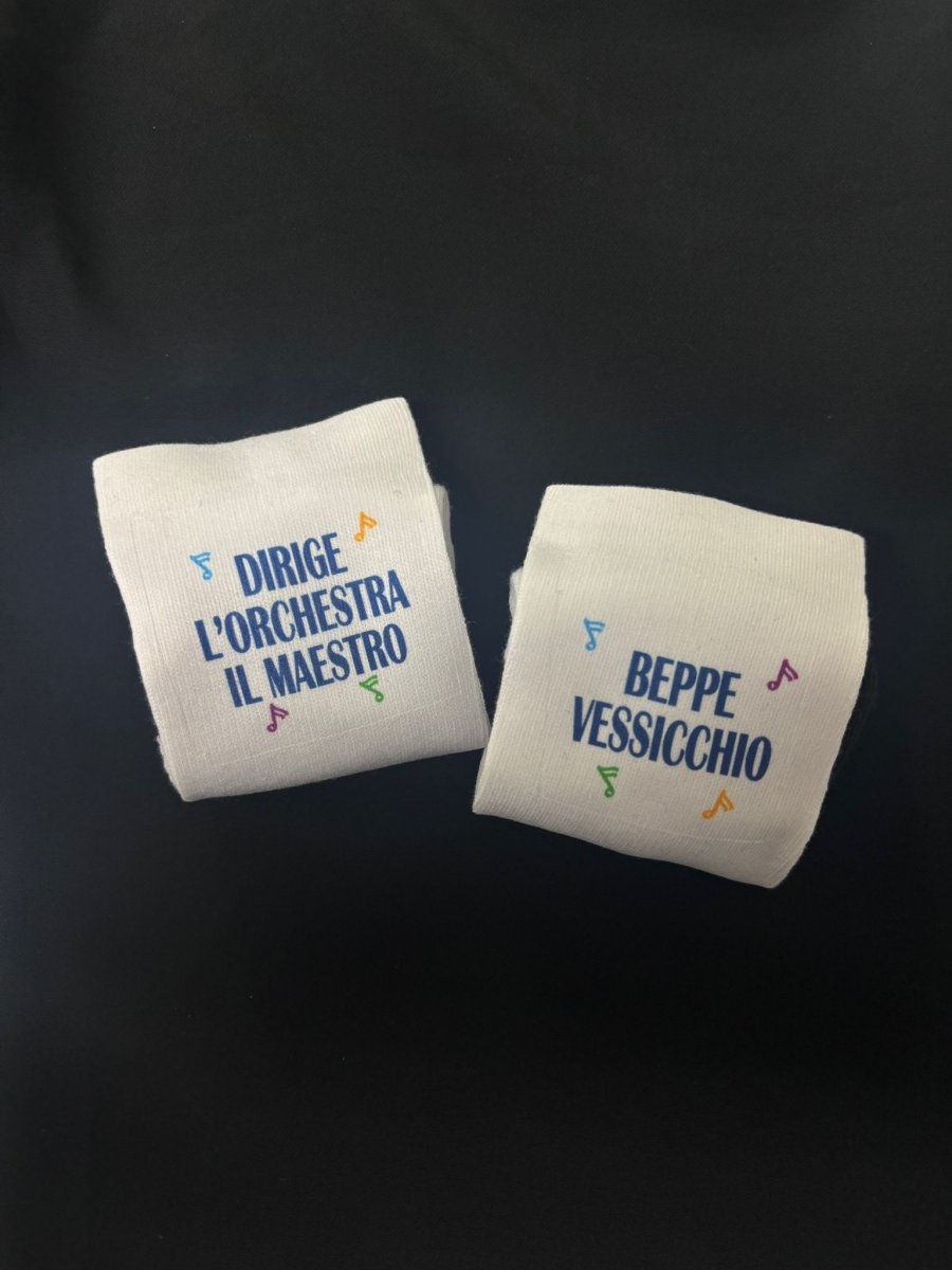 La stampa rappresenta uno degli eventi più attesi dell’anno, il Festival di Sanremo, con uno speciale omaggio a Beppe Vessicchio, il maestro che ha accompagnato numerosi artisti sul palco del Teatro Ariston. Con la sua direzione musicale e il suo talento straordinario, Vessicchio è diventato un’icona del festival, e questi calzini sono il modo perfetto per rendere omaggio al suo ruolo fondamentale nella storia di Sanremo. Il design, vivace e colorato, cattura l’essenza del festival, con note musicali, immagini del palco e dettagli che ricordano le magiche serate sanremesi.