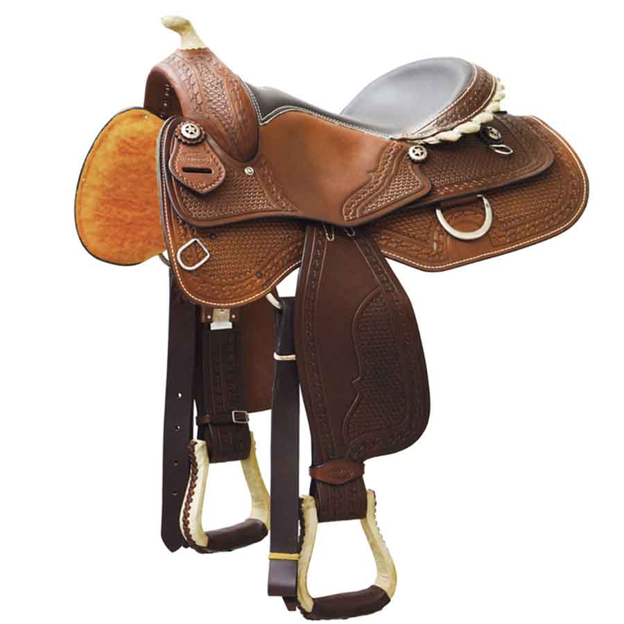 Sella reining Denver in cuoio con lavorazione basket e riporti in rawhide. Seggio in pelle. Colori: Cuoio Naturale, Cuoio Oliato, Testa di Moro. Misure: 16″, 17″.